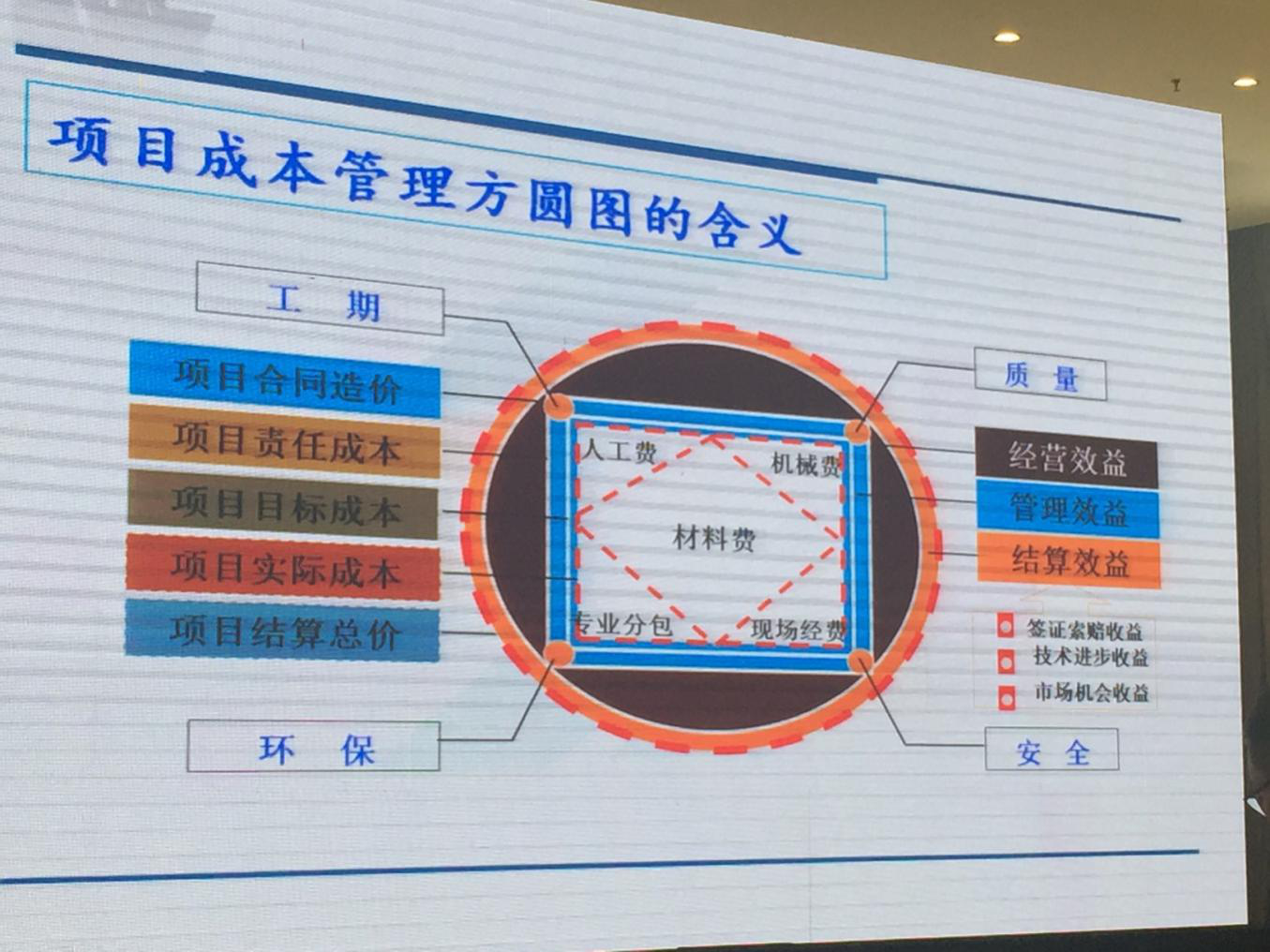 成本方圓圖中的圓形表示項(xiàng)目的造價(jià),包括項(xiàng)目合同造價(jià)和項(xiàng)目結(jié)算造價(jià)。正方形表示項(xiàng)目的各類成本,包括項(xiàng)目責(zé)任成本、項(xiàng)目目標(biāo)成本和項(xiàng)目實(shí)際成本。圓形的面積減去正方形的面積就是效益(圖中咖色部分)。當(dāng)圖中圓形的半徑擴(kuò)大時(shí)則表示項(xiàng)目的結(jié)算造價(jià)在合同造價(jià)基礎(chǔ)上提高,當(dāng)正方形的邊長(zhǎng)在科學(xué)有效的管理下縮短,則項(xiàng)目成本降低。當(dāng)兩者的面積差(圖中咖色部分)變大時(shí),效益則提高。所以,在項(xiàng)目管理過程中要不斷的尋找拓圓的方法和縮方的途徑。只有圓的有理、方的有據(jù),那效益提高就勢(shì)在必得。
