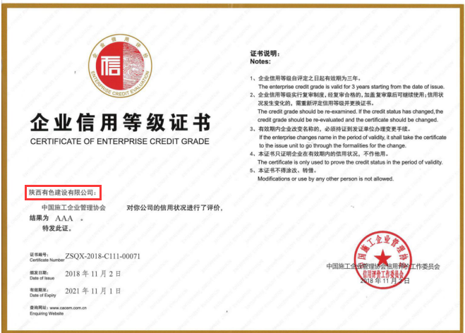 近日,中國施工企業(yè)管理協(xié)會印發(fā)了《關(guān)于公布2018年度工程建設(shè)企業(yè)社會信用評價(jià)結(jié)果的通知》(中施企協(xié)字〔2018〕57號),陜西有色建設(shè)有限公司被評為“2018年度工程建設(shè)企業(yè)社會信用評價(jià)AAA級信用企業(yè)”。這是繼公司連續(xù)榮獲省建協(xié)“AAA”信用評級后,獲得的又一殊榮。